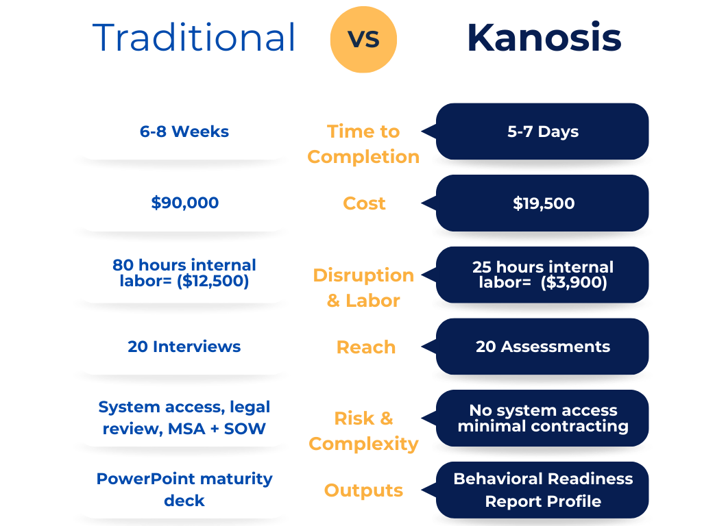Kanosis delivers a more seamless, cost-effective assessment with clearer, more actionable results than traditional consulting. The comparisons below show how dramatically the process, effort, and outcomes improve at both the team and organizational level.
