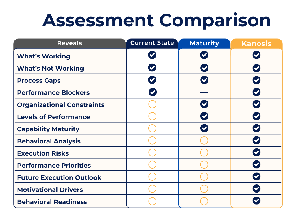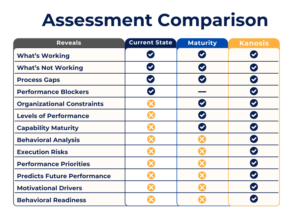 Current State and Maturity Assessments provide valuable snapshots, but they don’t investigate what makes an organization ready to execute successfully. Kanosis readiness assessments provide insights into the behavior and practices that drive how people think, act, and respond to change. Our Organizational Behavioral Diagnostics model goes beyond the processes and capabilities. This empowers leaders with a deeper, more accurate understanding of their organization’s performance engine and what actions will likely create the greatest impact moving forward.