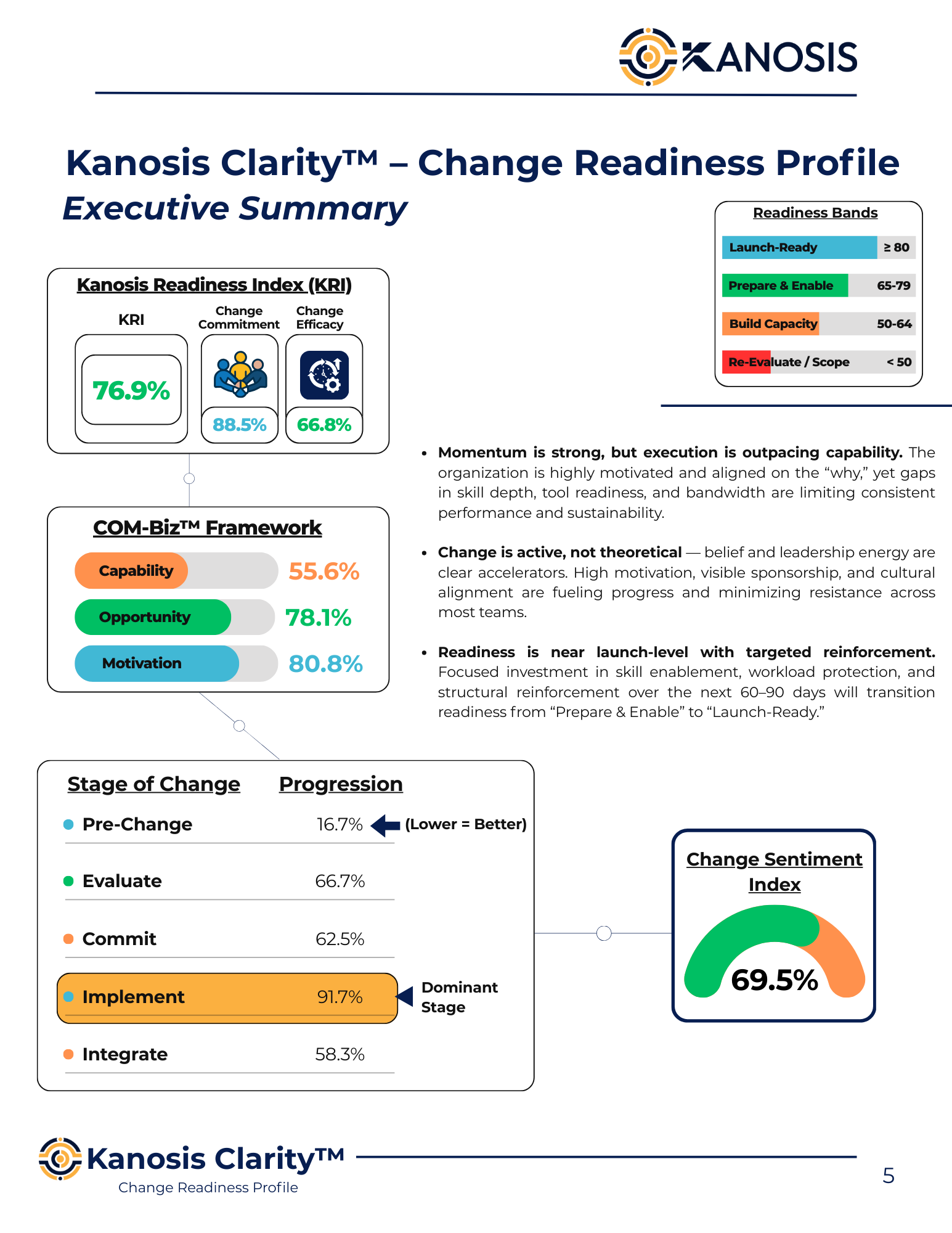 Our Change Readiness Assessment is available today and serves as the ideal starting point for any organization seeking sharper insight, reduced risk, and accelerated execution. We are currently expanding the full Kanosis Clarity™ diagnostic suite with future release planned for early 2026.