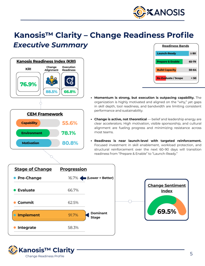 Our Change Readiness Assessment is available today and serves as the ideal starting point for any organization seeking sharper insight, reduced risk, and accelerated execution. We are currently expanding the full Kanosis Clarity diagnostic suite with future release planned for early 2026.