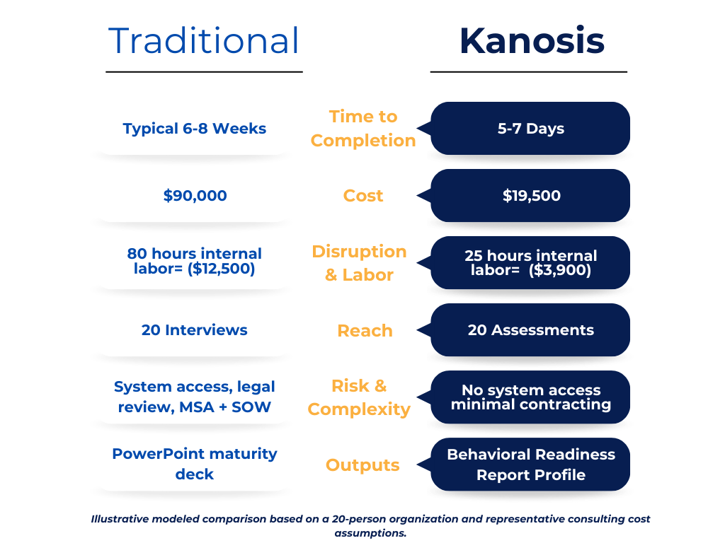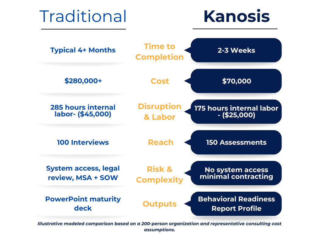 The primary difference is how the work is structured. We invested in efficiency and did not build our business model solely on the billable hour. Kanosis took the time to build its own proprietary assessment IP, enabling us to extract maximum insight with minimal burden which avoids the expensive interview process. The result: deeper, broader, and more actionable data in a fraction of the time.